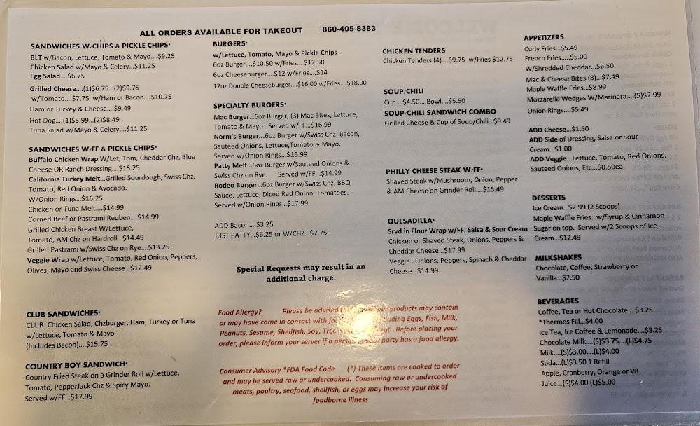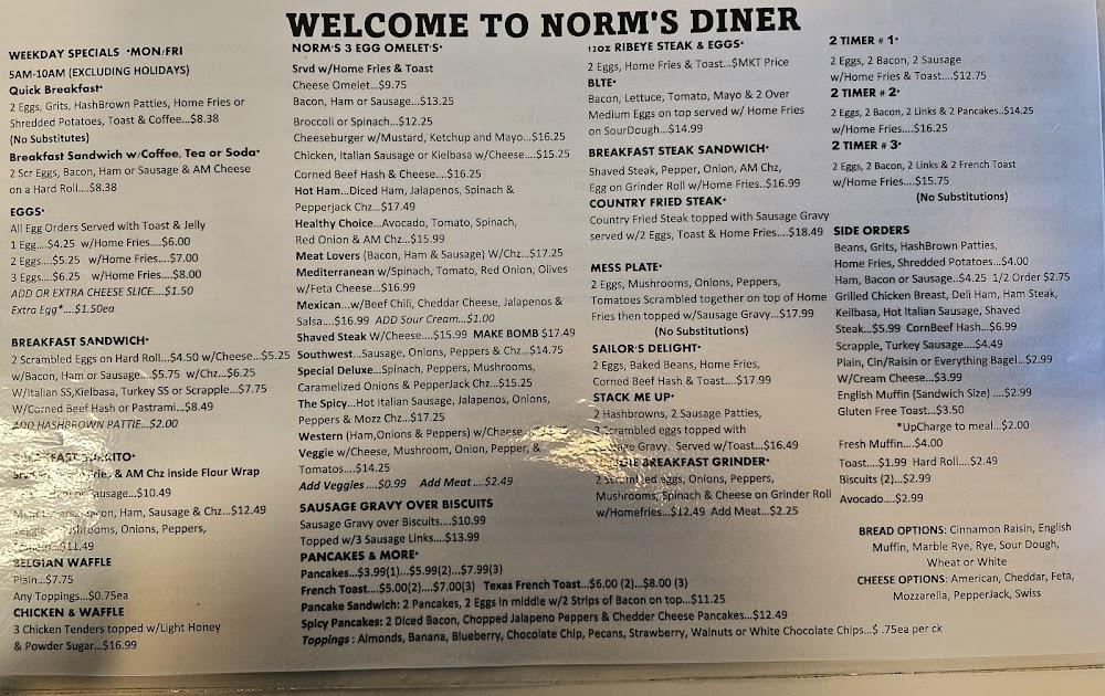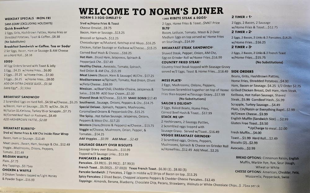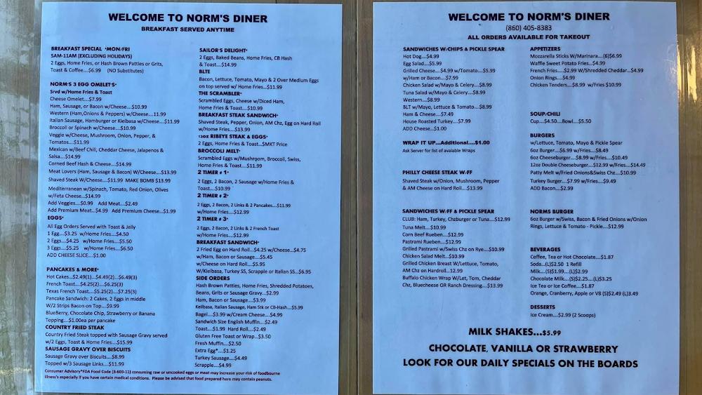 Welcome to Norm's Diner, your go-to spot in Groton, CT, for a delightful dining experience! Nestled at 171 Bridge St, we pride ourselves on serving up hearty American classics from breakfast to dinner. Whether you're in the mood for our excellent café, local specialties, or a quick bite, we’ve got you covered with dine-in, takeout, and delivery options. Enjoy our relaxed ambiance, complete with accessible seating and free Wi-Fi. Perfect for families, students, and everyone in between, Norm's Diner is a safe and welcoming place. Join us for a meal that feels like home!